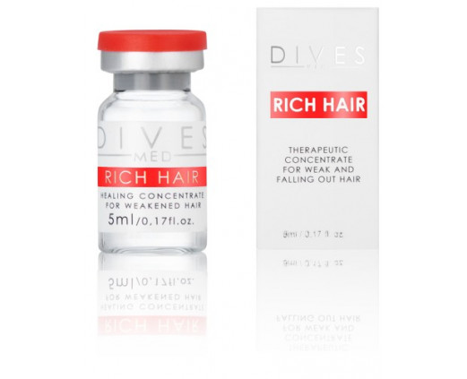 Dives med. Rich Hair to produkt przeznaczony do mezoterapii skóry głowy. Zapobiega wypadaniu włosów, leczy łysienie, pogrubia strukturę włosa, a także korzystnie wpływa na ukrwienie skóry głowy. Unikalny kompleks 26 składników radzi sobie zarówno z przerzedzeniem włosów w wyniku choroby, jak i czynniki zewnętrzne.