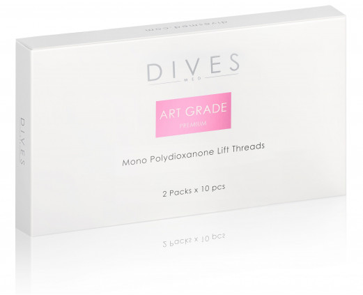 Dives Med. Art. Grade Premium to koreńskie nici do remodelingu, liftingu i intensywnego zagęszczania skóry. Wykonane z polidioksanonu o najwyższym profilu jakości i bezpieczeństwa potwierdzonym certyfikatem medycznym CE i KFDA. Nić zbudowana jest z pojedynczego włókna PDO zespolonego z wysokiej jakości igłą, zapewniającą bezpieczeństwo i łatwość implantacji. Produkt jest całkowicie bezpieczny, pozbawiony ryzyka alergii, przerostów i zbliznowaceń.