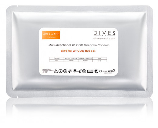Dives Med. Art. Grade Multi-directional 4D COG Extreme Lift Threads to nici medyczne przeznaczone do liftingu skóry brwi, czoła i linii żuchwy. Nici z systemem mikroskopijnych haczyków zwróconych wielokierunkowo i rozmieszczonych w 4-wymiarowej projekcji wokół nici, umieszczone w komfortowej kaniuli łódeczkowatej typu-W, zmniejszającej traumatyzacje tkanek i ryzyko wystąpienia zasinień. Zapewniają natychmiastowy i trwały efekt silnego napięcia i odmłodzenia skóry.