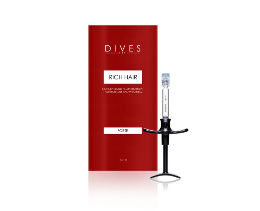 DIVES med Rich Hair Forte to peptydowy stymulator anti-hair loss z kwasem hialuronowym (10 mg/ml), 5 biomimetycznymi peptydami, polipeptydami, kompleksem aminokwasów i witaminami B. Hamuje wypadanie włosów, reaktywuje mieszki włosowe i wspiera fazę anagenu poprzez poprawę mikrokrążenia skóry głowy.