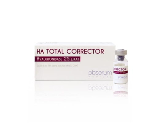 PBSerum Total Corrector to preparat posiadający najlepszą na rynku hialuronidazę, która w procesie hydrolizy eliminuje skutki niewłaściwego podania lub reakcji uczuleniowych po podaniu wypełniaczy na bazie kwasu hialuronowego. Proces całkowitego rozpadu i usunięcia kwasu hialuronowego z organizmu trwa do 3 tygodni, natomiast pierwsze efekty zauważalne są już po kilku minutach. Enzym można zastosować bezpośrednio po podaniu kwasu hialuronowego lub w innym czasie, nawet po upływie kilku miesięcy od zabiegu z wypełniaczem. W wyniku podania hialuronidazy nadmiar kwasu zostaje hydrolizowany, skóra w miejscu podania staje się gładka, a obrzęki ulegają znacznej redukcji.